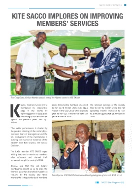 The Chief Guest, Carilus Ademba awards one of the highest savers in KITE SACCO.