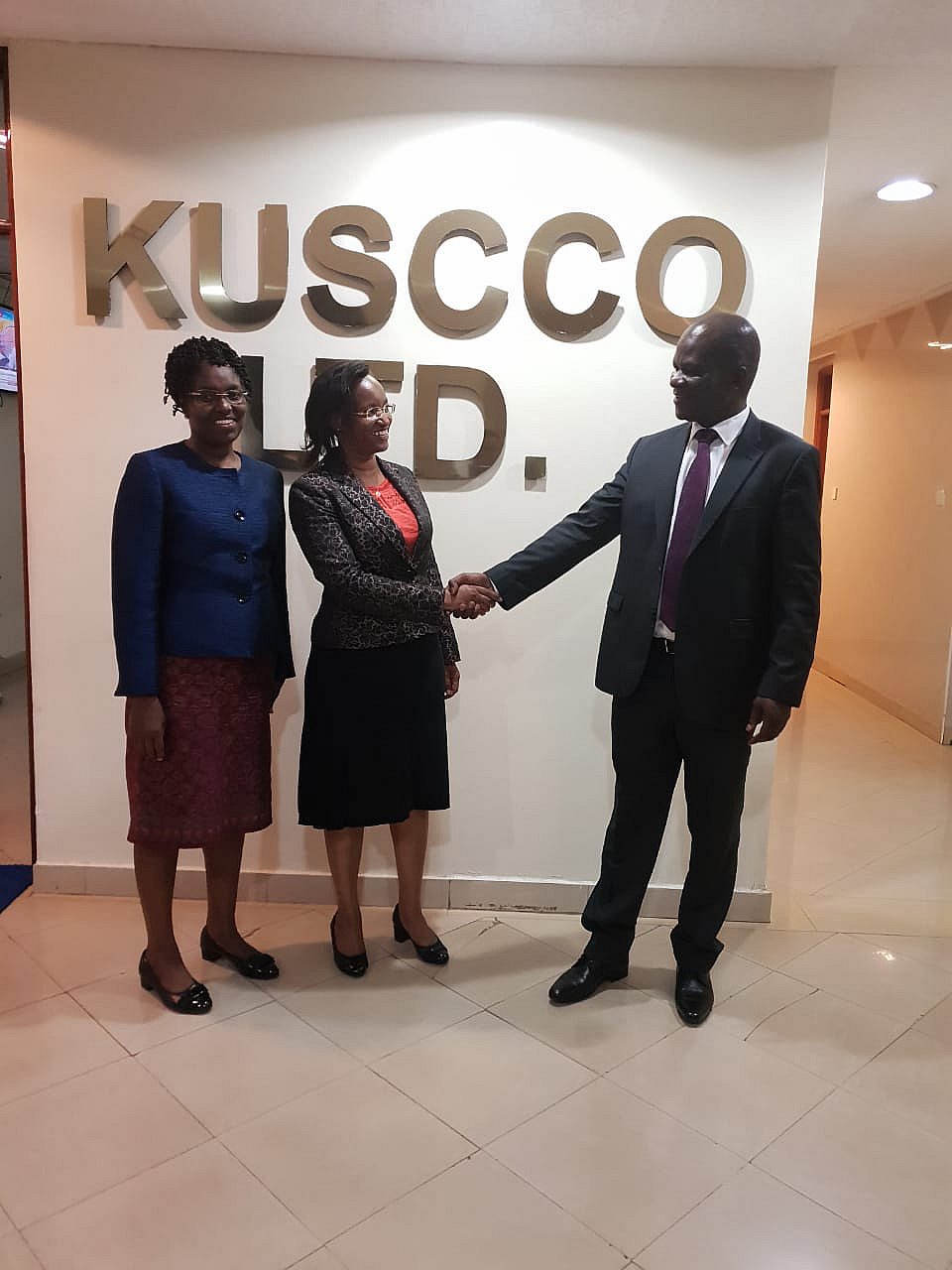 Principal Secretary Susan Mochache, CBS(centre) Ministry of Industry, Trade and Cooperatives with Mary Mungai, OGW, Commissioner for Cooperative Development on a courtesy call at Kuscco centre with George Ototo, MBS, Managing Director, Kuscco Ltd.